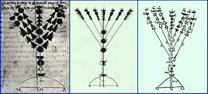 Left: Maimonides' late 12th century ignorant depiction of the Temple menorah; Center: Rabbi Yosef Kapach's reinterpretation of Maimonides' ahistoric drawing; Right: another interpretation from an unknown author in Yemen.